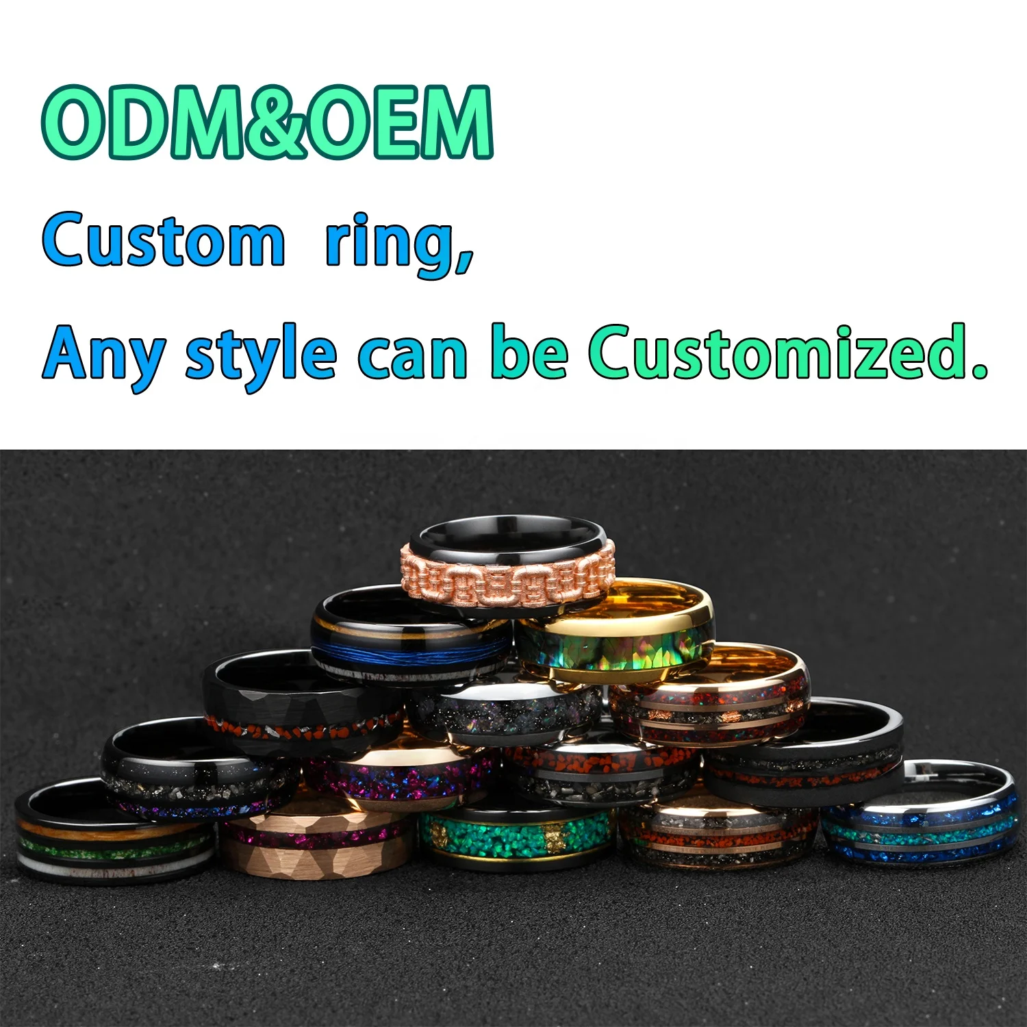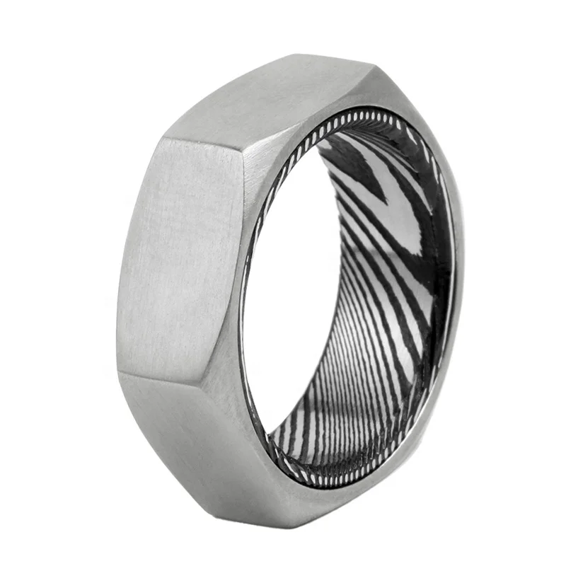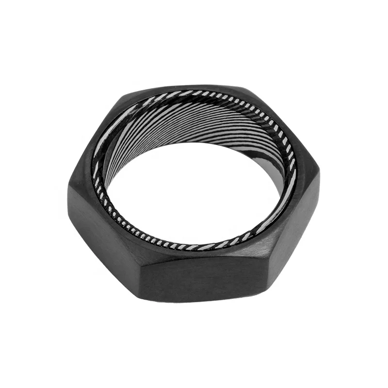 TIZTI Hexagon Ring 8mm Trendy Black Zirconium with Damascus Steel Inner Men Ring Wedding Band